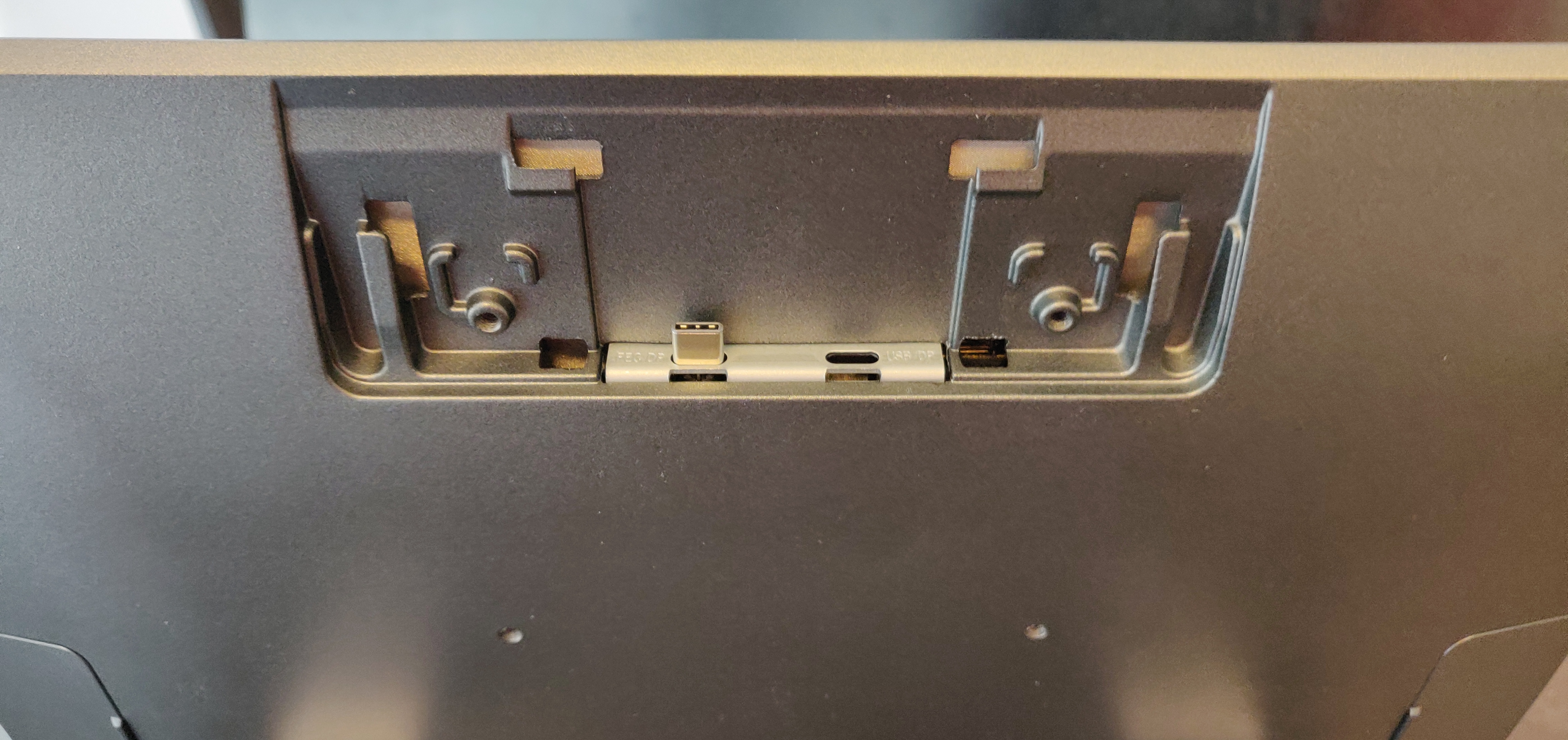 Sluit de voeding aan op het beeldscherm op de aangegeven plek in de foto. Zoals boven de aansluiting te zien moet je de kabel een kwartslag draaien zodat deze goed wordt aangesloten.